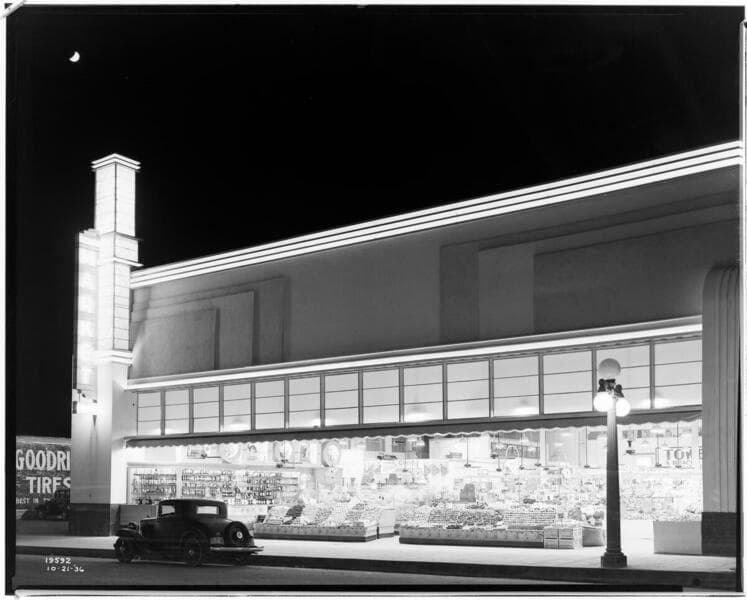 L1.3 - Lighting, stores - Box Market - exterior at night - Whittier