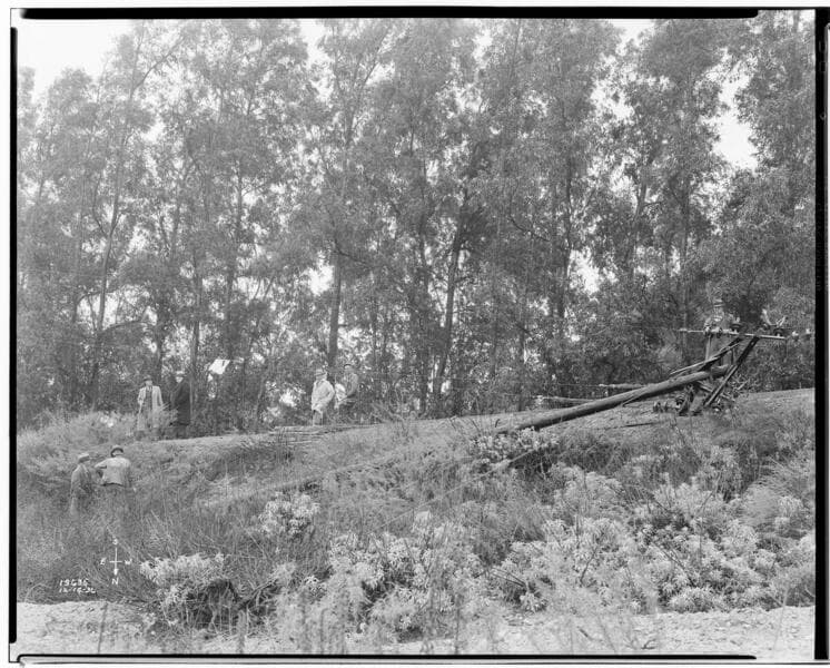 A1.2 - Accidents - Ross Swords fatal accident - Looking towards road across downed pole and lines. Men standing along the road and investigators are at scene the scene.