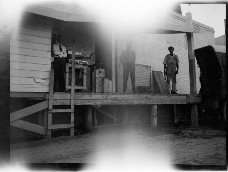 [Public ice house with customer purchasing a block of ice at the loading dock in his touring car]