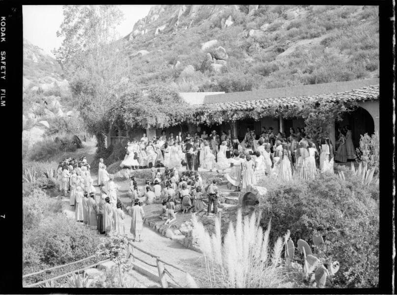 Hemet - Ramona Pageant 1957 - Celebration of native American people at a hacienda with television coverage.