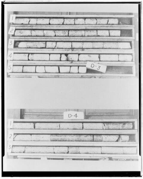 Copy neg comparing Core samples taken from Huntington Lake Dams in May 1937. Sections of D-9 and D10.