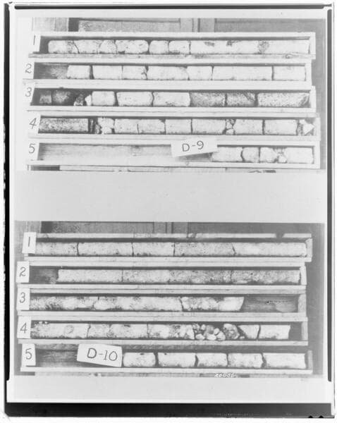 Copy neg comparing Core samples taken from Huntington Lake Dams in May 1937. Sections of D-1 and D2.