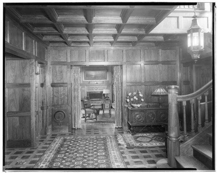 H2.7 - Home Living Room - Air Conditioning - Cobb residence - Altadena - living room. [luxurious Victorian woodwork: crown moldings, tooled wood fireplace mantle, art work on walls, and elaborate draperies]