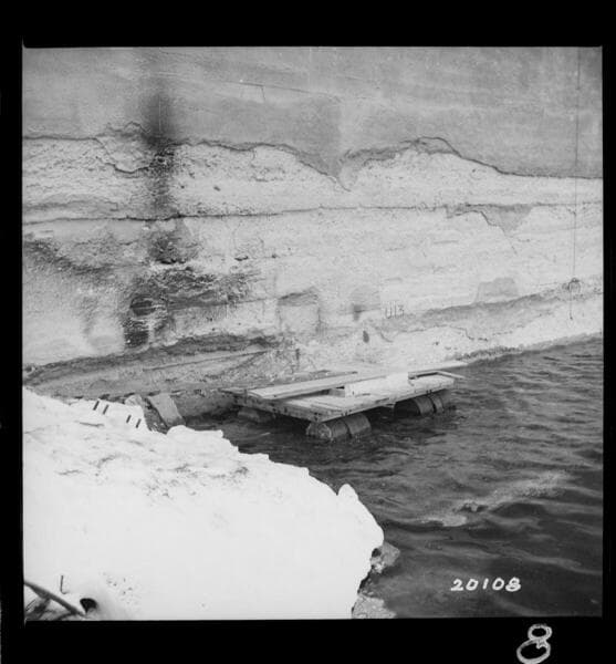Upstream face Dam 1, showing condition of concrete in vicinity of core-drill hole U-2 prior to drilling