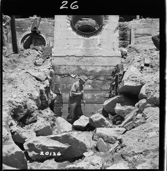 Dam 1. Photo #2 Cutting away cribbing found in excavating for foundation under West 42" sluice pipe. At upper end adjacent to existing concrete.