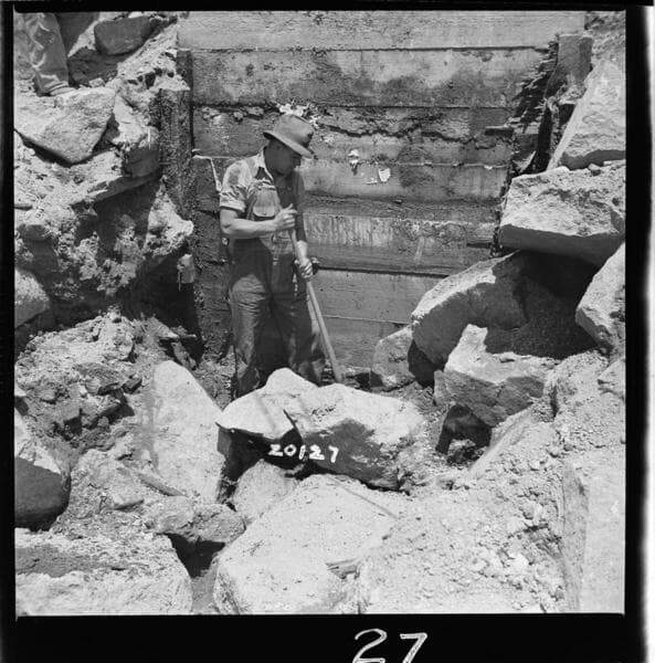 Dam 1. Photo #1 showing cribbing discovered during excavation for West 42" pipe at upper end adjacent to existing concrete.