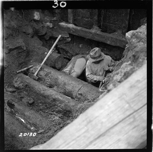 Dam 1. Photo #4. Close-up view of double row of cribbing cut through while excavating for foundation under west 42" sluice pipe extension.