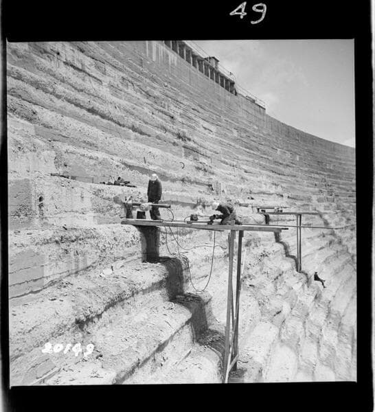 Upstream face Dam 1, showing condition of concrete in vicinity of core-drill hole U-2 prior to drilling.