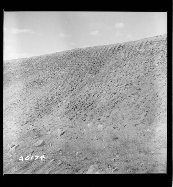 Big Creek, Huntington Lake Dams - Progress of backfills on Huntington Lake Dams by Stone & Webster Co. - Progress picture, rock facing of fill, Dam #1.