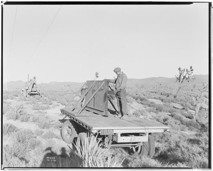 Boulder-Chino Transmission Line - stringing ground wire near "Old Dad".