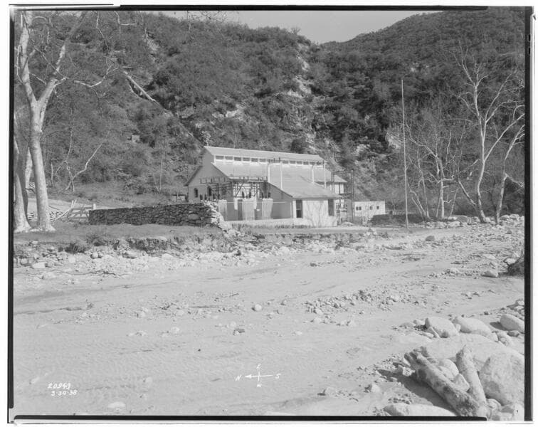 Santa Ana River #2 Powerhouse - Storm Damage of March 2nd at SAR 2 - general view from southwest.