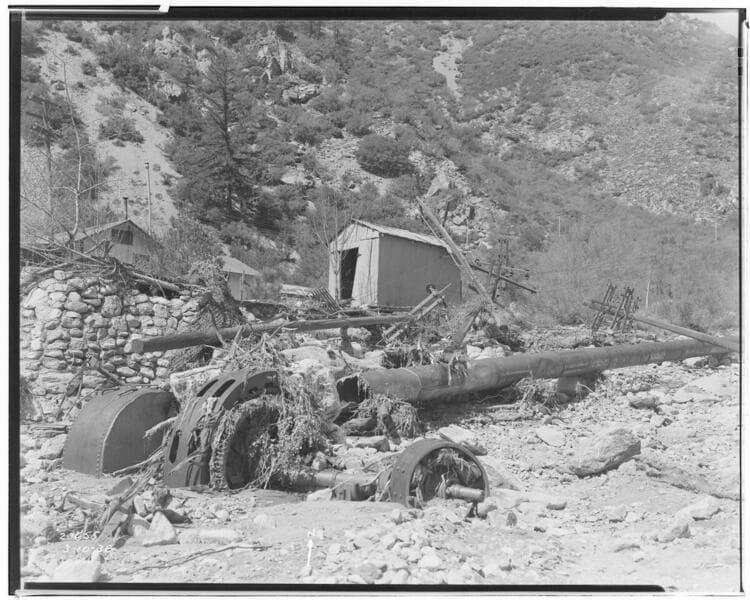 Ontario No. 2 Powerhouse - Storm damage to Ontario #2 headworks in San Antonio Canyon after flood on March 2, 1938.
