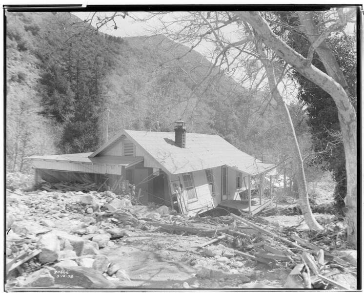 Sierra Powerhouse - Destroyed Sierra Powerhouse operator's cottage in San Antonio Canyon after flood March 2,1938. "girls dormitory"