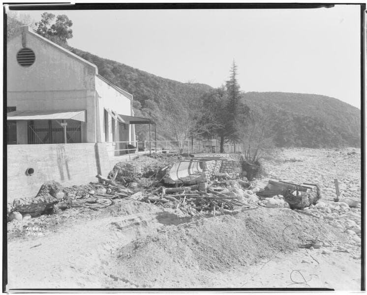 Santa Ana River #3 Powerhouse - Storm damage [close shot of Powerhouse from wash filled with sand & debris after March 2nd flood.