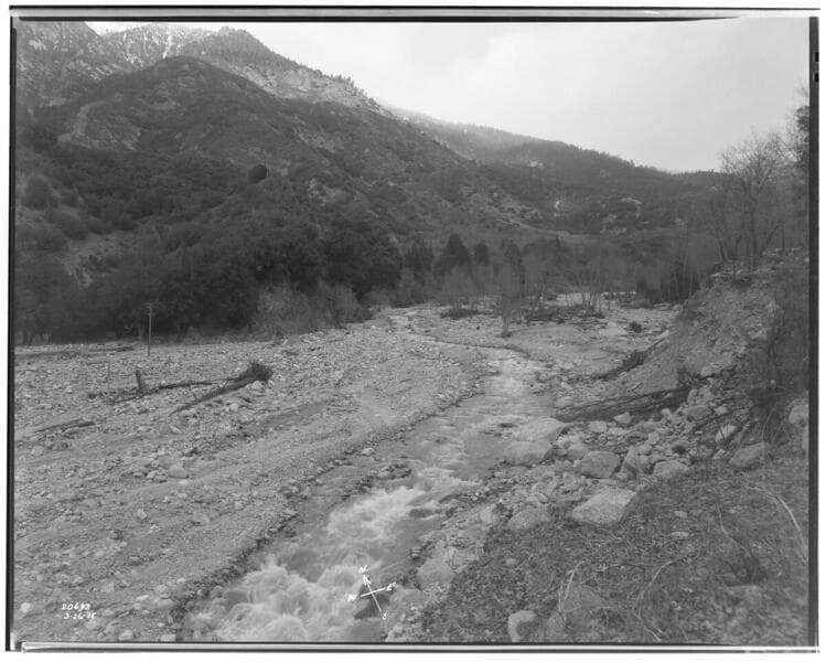 Mill Creek 1, 2&3 Powerhouse - Storm damage - Mill Creek Headworks #3 - looking east up canyon - [site of headworks.]