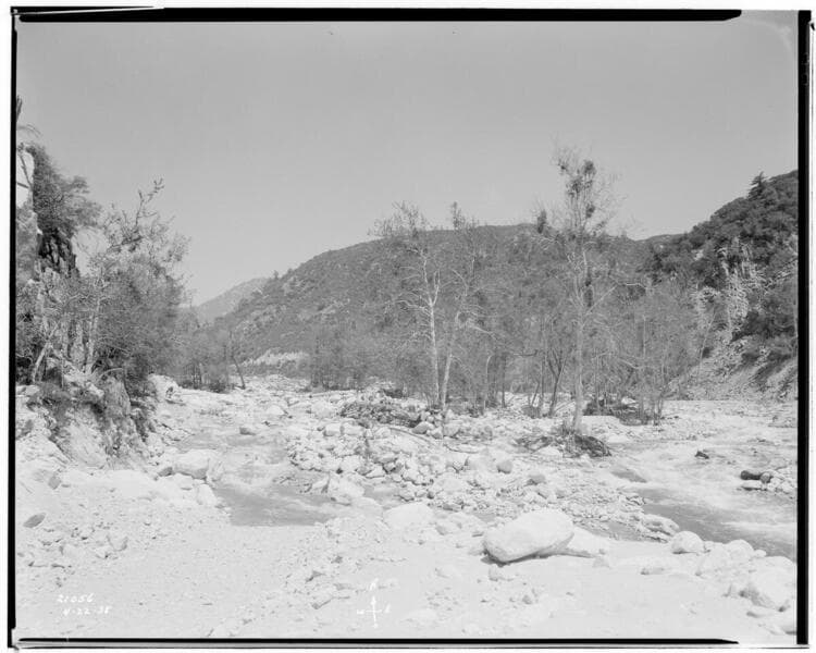 Santa Ana River #1 Powerhouse - Storm Damage (of March 2nd) at SAR 1 Headworks. [operators cottage in background]