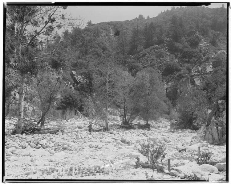 Santa Ana River #1 Powerhouse - Storm Damage (of March 2nd) at SAR 1 Headworks. [operators cottage in background]