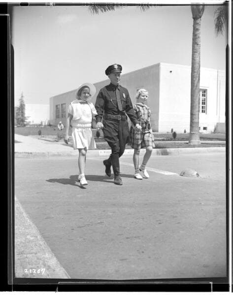 A1.7 - "Safety First" - Officer J. H. Deist [controling traffic for children in crosswalk].