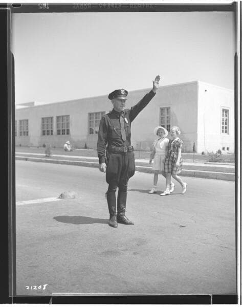 A1.7 - "Safety First" - Officer J. H. Deist [holding traffic at crosswalk].