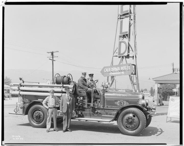 A1.7 - "Safety First" - San Gabriel Police Chief (H. Powell Sloan) and 3 motorcycle patrolmen (Wilson, Spear, & McCrory) on their bikes parked in front of the San Gabriel Mission.