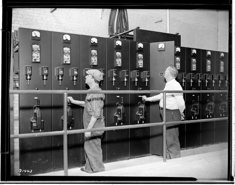 Pioneer - Flintkote Co. - cutting roll roofing.