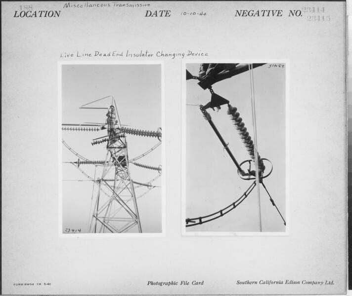 Miscellaneous Transmission - Live line dead-end insulator changing device. [plus close-up of insulator (#23413) on same photocard]