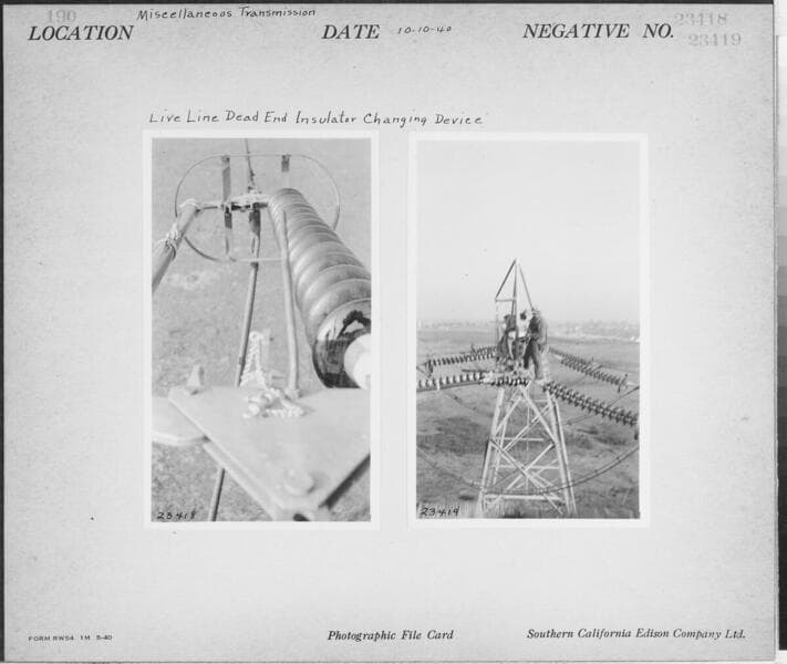 Miscellaneous Transmission - Live line dead-end insulator changing device. [plus close-up of insulator (#23415) on same photocard]
