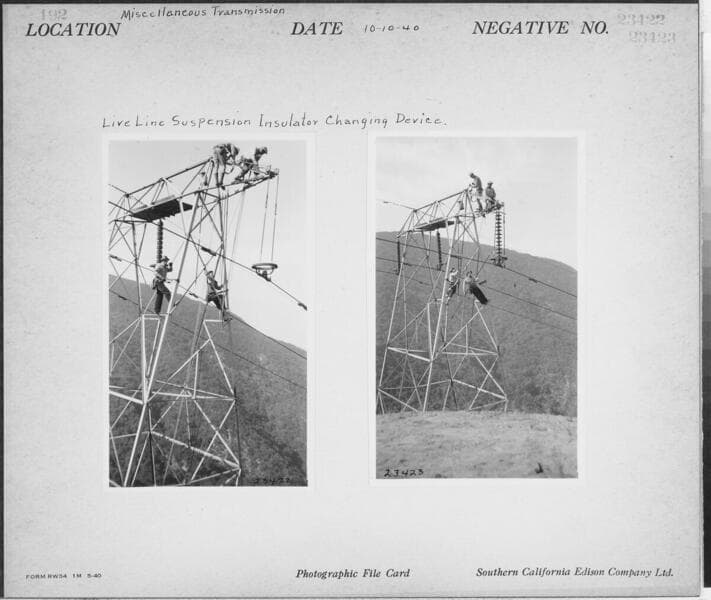 Miscellaneous Transmission - Live line suspension insulator changing device. [note, the early use of hard hats; plus additional, similar shot (#23421) on same photocard]