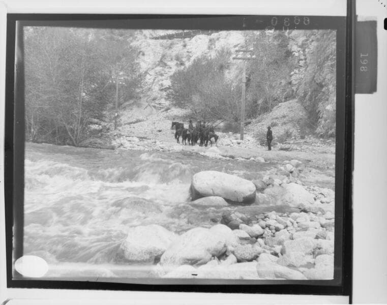 Men on horseback surveying the transmission lines along the Santa Ana River