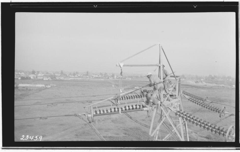 Miscellaneous Transmission - Live line dead-end insulator changing device. [plus close-up of insulator (#23413) on same photocard]