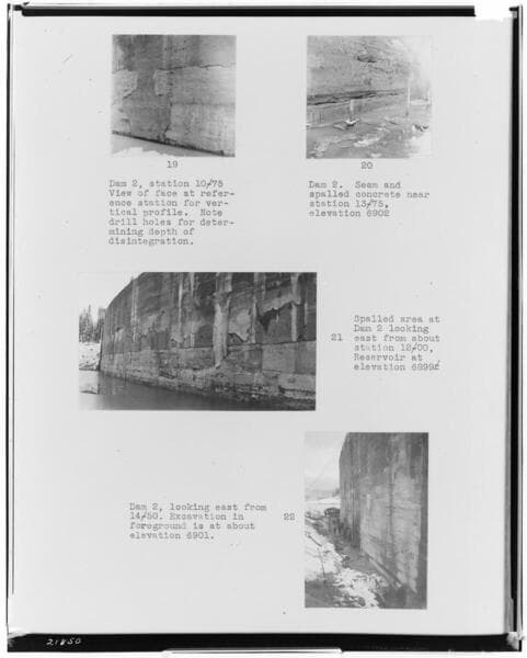 Big Creek, Huntington Lake Dams - Copy of Page 3 of Stone & Webster Report on Backfills on Dams at Huntington Lake: 4. Dam #1 - Badly disintegrated and porous concrete in vertical joint near station 5+66, elevation 690-4, after partial removal. Part of old repair plug in lower left center. 5. Dam #1 - Area near station 5+66, elevation 6904. Chipping in progress. Note two holes from which air escaped when applied to 4" drain through downstream backfill. 6. Dam #1. A second view of leak intakes near station 5+66, elevation 6904'. 7. Dam #1. Area near station 5+66, elevation 6904' after guniting.