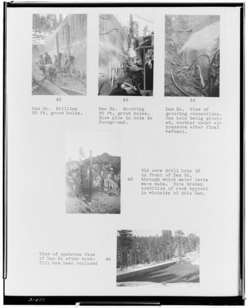 Big Creek, Huntington Lake Dams - Copy of Page 5 of Stone & Webster Report on Backfills on Dams at Huntington Lake: 12. Face of Dam 2 after guniting chipped out cracks east from station 14+00. Note frost protection. 13. Core drilling at west end of Dam 2. 14. Cleaning grout holes east end of Dam 2. Water and air introduced uder pressure through pipe inserted in hole 20 is blowing out of hole 18.