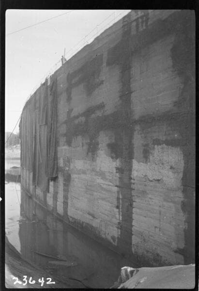 Big Creek, Huntington Lake Dams - Face of Dam #2 after grouting chipped out cracks, East from Station.