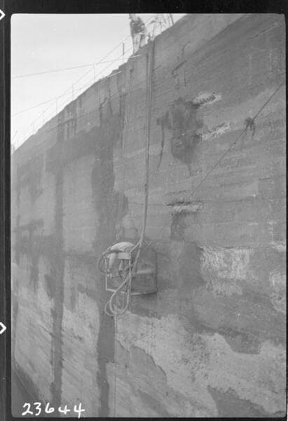 Big Creek, Huntington Lake Dams - Face of Dam #2 after grouting chipped out cracks, East from Station.