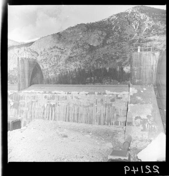 Big Creek, Florence Lake Dam - Construction at Dam looking square at upstream side of Spillway.