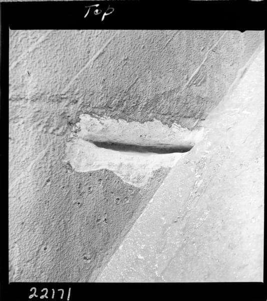 Big Creek, Florence Lake Dam - Close-up of open seam at junction of angle buttress 10 and Arch 11 at elevation 7288. 1 1/8" barrel reinforcing steel exposed by chipping and cleaning out seam. This seam is directly opposite spurt noted on downstream side during inspection.