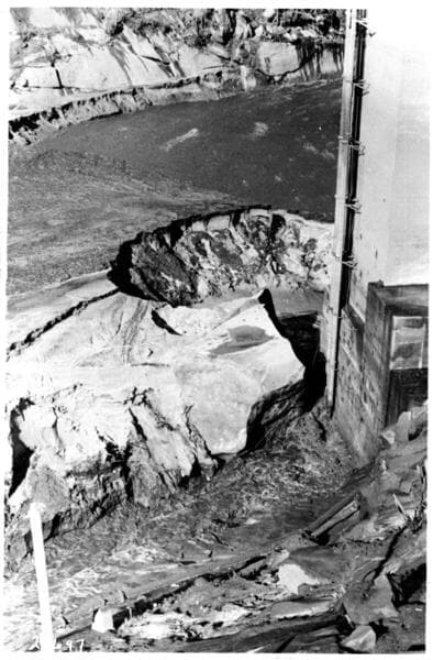 Big Creek Powerhouse #3 - Damsite Dam #6 - View showing Tunnel intake, large boulder which has to be broken, also cofferdam and flume intake end.