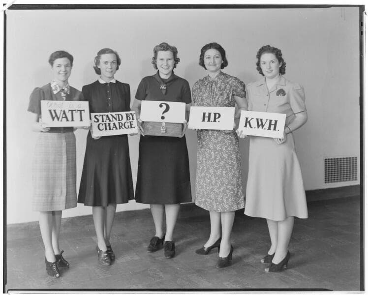 P1.1 - Group Portraits - Five girls [women] holding signs advertising electricity at Pomona