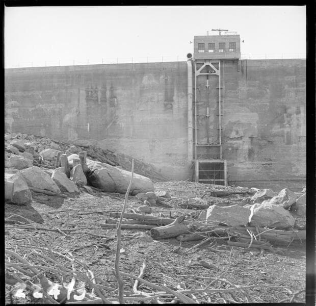 Big Creek, Huntington Lake Dams - Dam 2 Upstream face 8+75 to 9+75 prior to guniting or backfilling.