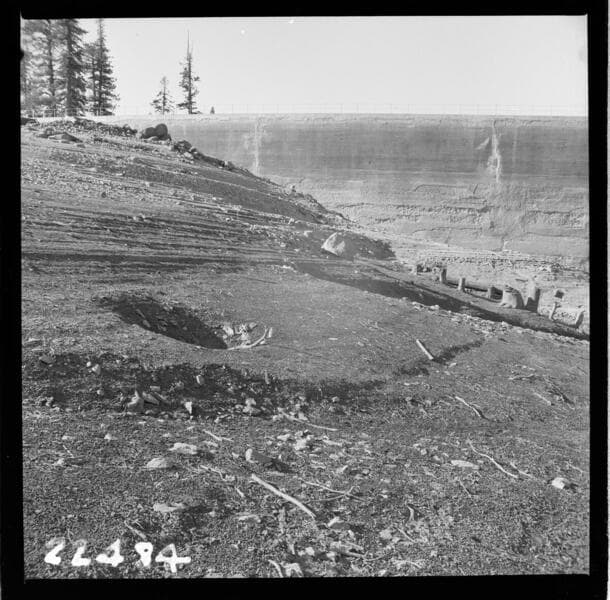 Big Creek, Huntington Lake Dams - Dam 2 Upstream face 17+40 to west end prior to guniting or backfilling.