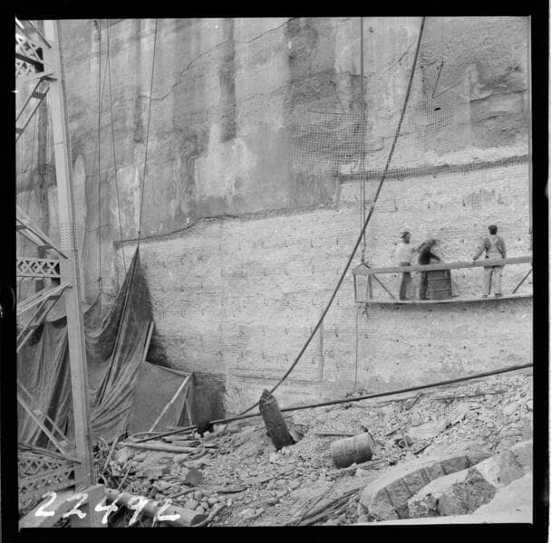 Big Creek, Huntington Lake Dams - Dam 1 Upstream face - Approx. stationing 11+00 to 11+50. Applying steel reinforcing to chipped area near west end prior to guniting.