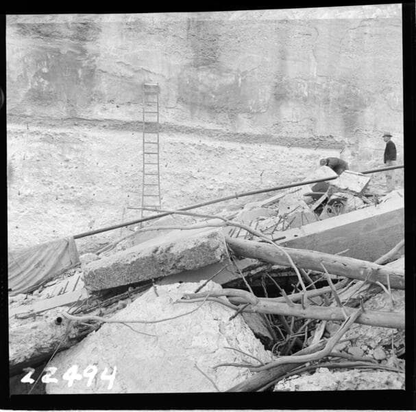 Big Creek, Huntington Lake Dams - Dam 1 Upstream face - Approx. stationing 11+00 to 11+50. Applying steel reinforcing to chipped area near west end prior to guniting.