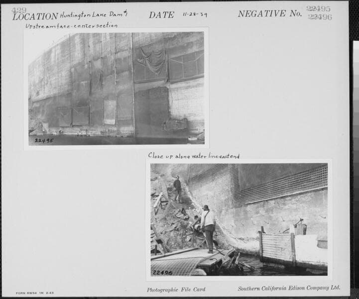 Big Creek, Huntington Lake Dams - Upstream Protection another view of first fill along upstream face of Dam #2, at east end.