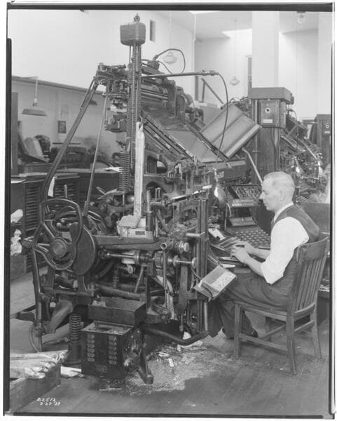 Man working with Linotype machine at Beverly Hills Printing Office