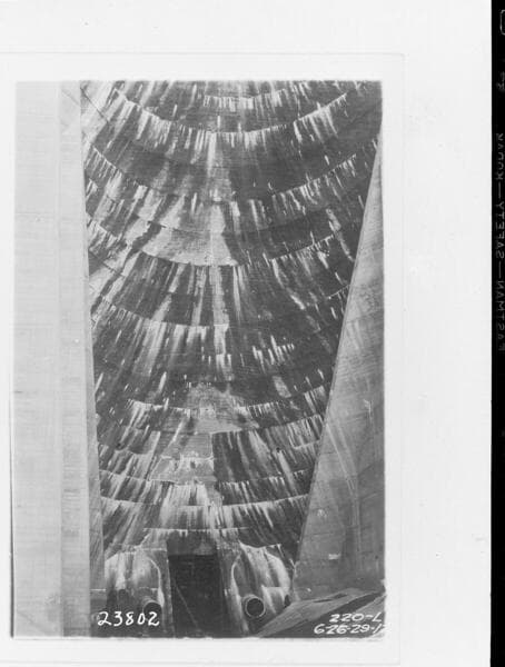 Big Creek, Florence Lake Dam - Concrete floor in Arch 53 taken from top of west sluice pipe and looking downstream.