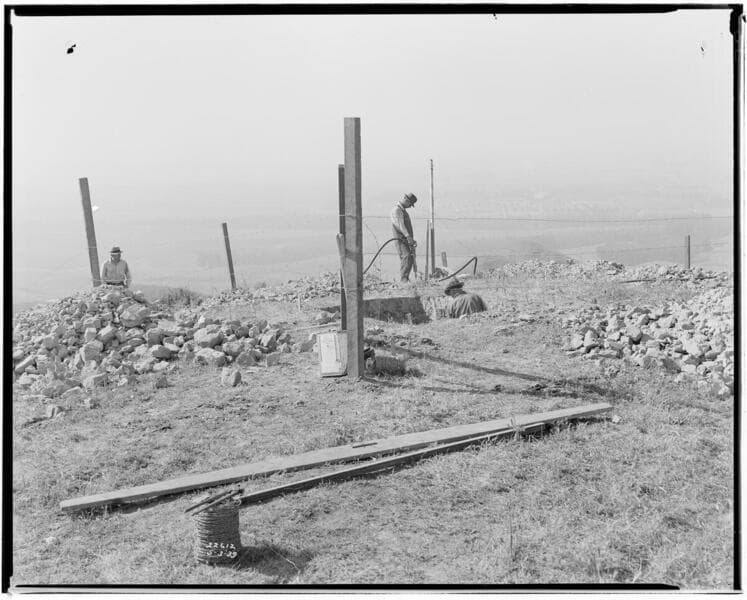 Chino-Barre Transmission Line - construction [Surveying footing placement at tower site]