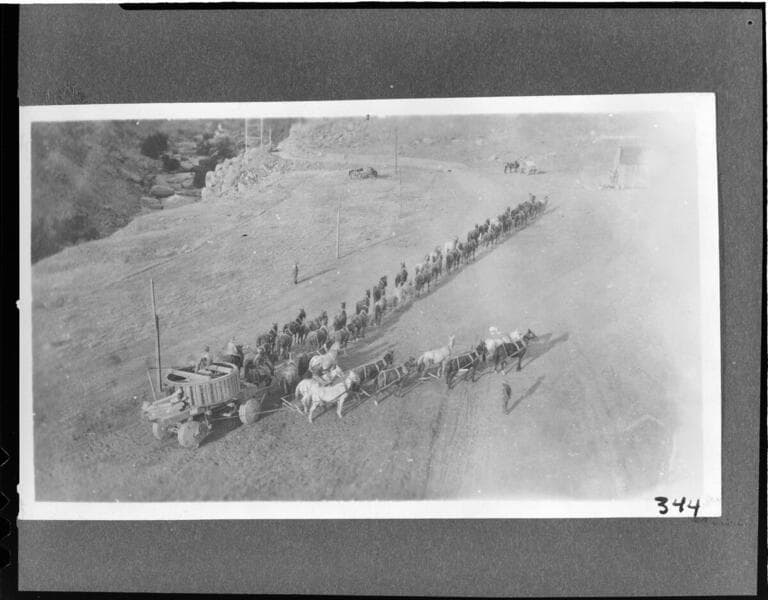 A section of penstock for Kern River #1 Hydro Plant being hauled up the trail in Kern River Canyon by a team of horses