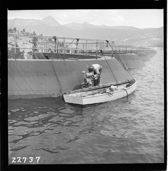 Big Creek, Florence Lake Dam - Drilling core U-7-1 from upstream face of Arch 7