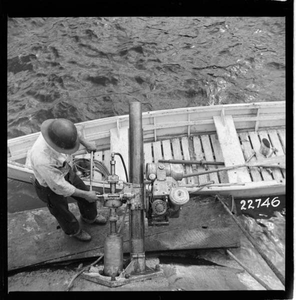 Big Creek, Florence Lake Dam - Drilling core U-26-1 from upstream face of Arch 26