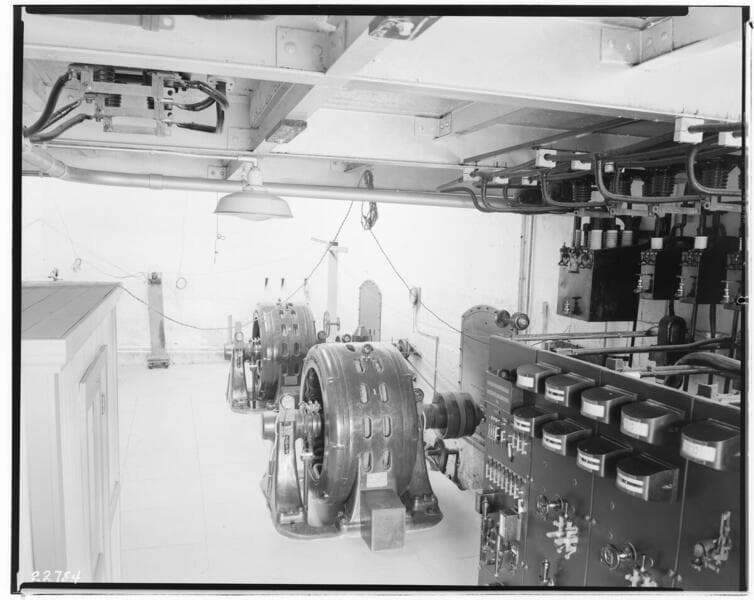 Sierra Powerhouse - Interior view showing generators, switchboard and multi-gap lightning arresters.
